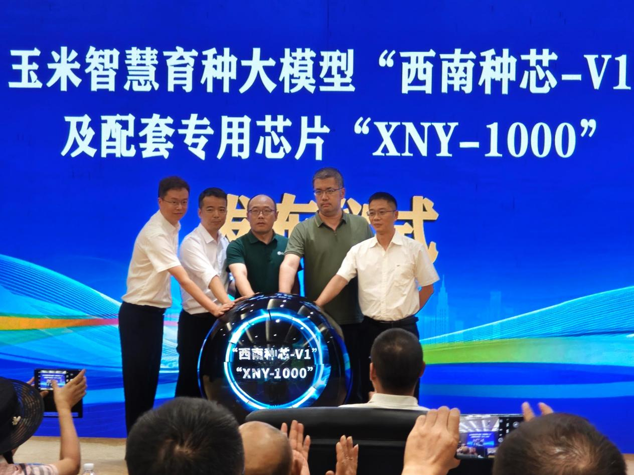 在十四五国家重点研发计划“农业生物种质资源挖掘与创新利用”重点专项的支持下,为实现育种技术从“经验选配”迈向“智慧育种”的迭代创新,显著提升品种选育的效率与质量,9月8日四川农业大学与博瑞迪在云南省红河州弥勒市共同发布了国内首款玉米智慧育种大模型“西南种芯-V1”及配套专用芯片“XNY-1000”。在当日举行的成果发布会上,四川农业大学科研团队主要技术骨干刘海岚、向勇、夏超和李芦江与石家庄博瑞迪生物技术有限公司作物事业部副总经理陈兴明共同为成果发布按下启动键。